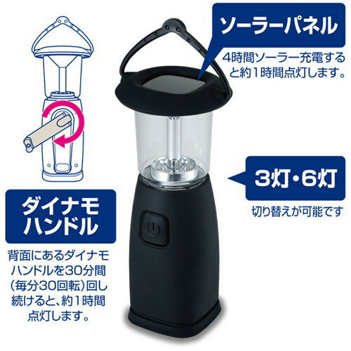 ■6LED(3灯・6灯の切り替えが可能) ■充電方式:ソーラーパネル、ダイナモハンドルによる充電 ■サイズ:89×82×230mm ■重量:230g ■ソーラー充電の場合■ ・充電時間:4時間(晴天時、太陽光がソーラーパネルにあたる条件下) ・点灯時間:約1時間点灯 ■ダイナモ充電の場合■ (ダイナモハンドルを回転させます) ・充電時間:30分間(毎分30回転) ・点灯時間:約1時間点灯